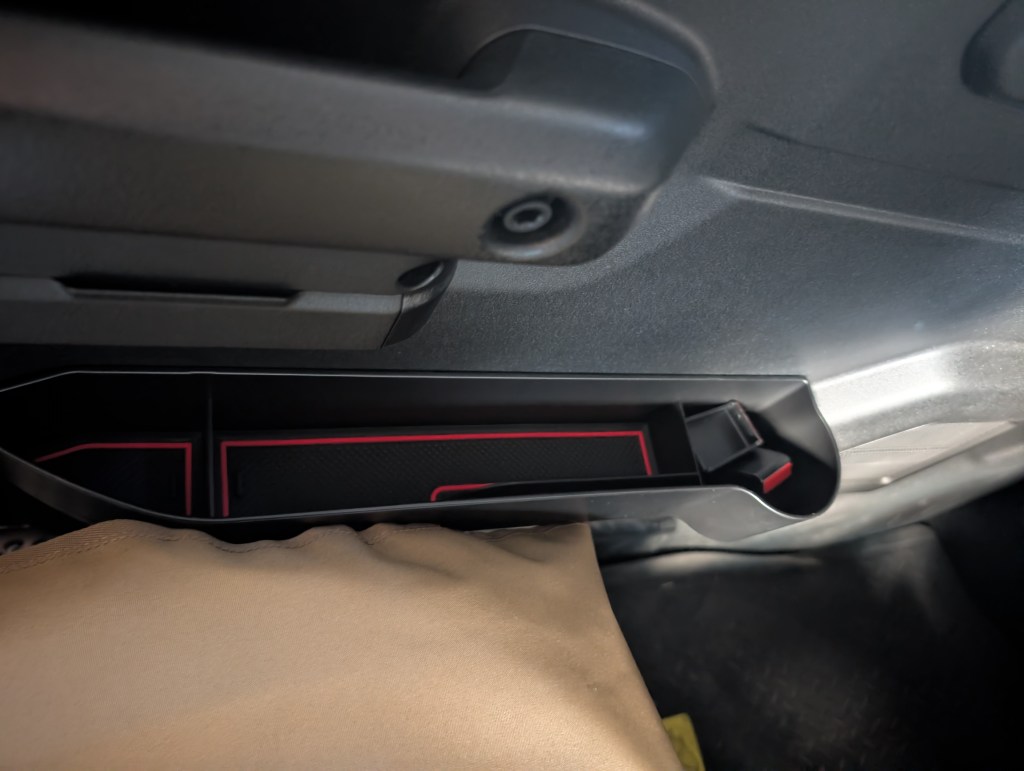取付は、説明書はないですが、専用ネジを少し緩めて、ドアコンソールにはめ、ネジ締めをします。両面テープが付いていますが、なくてもガッチリ付きます。
