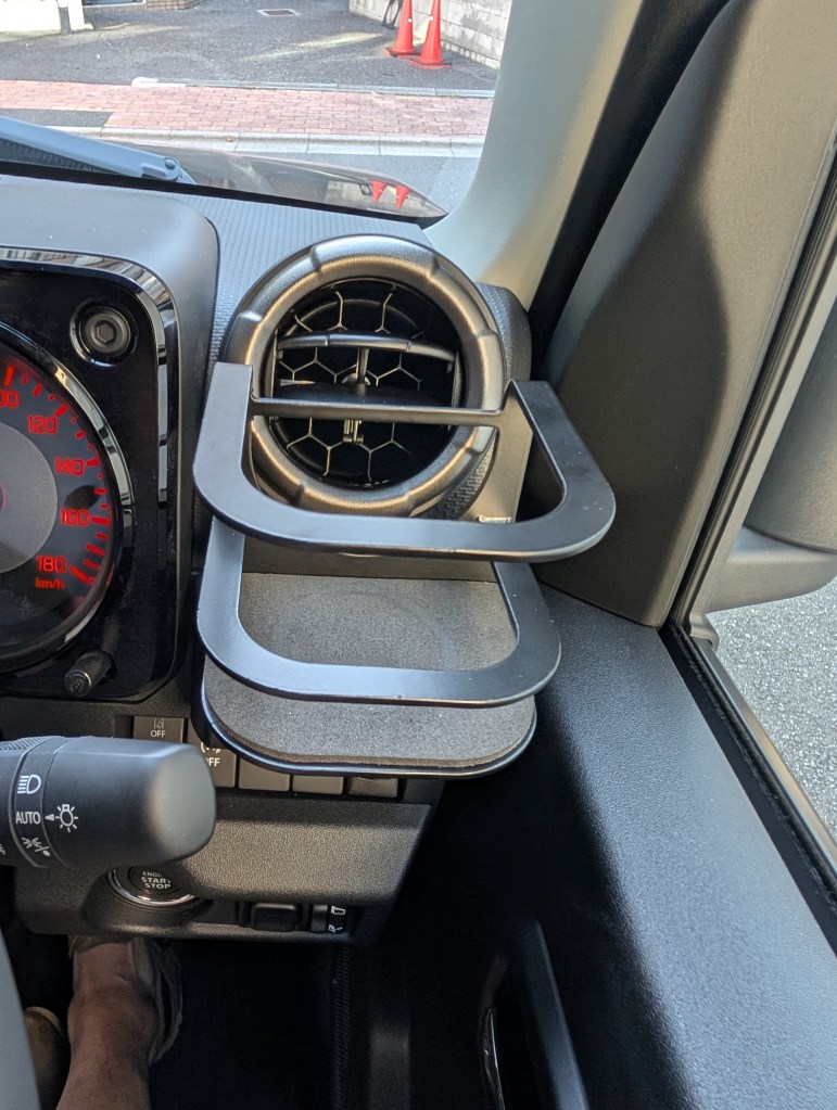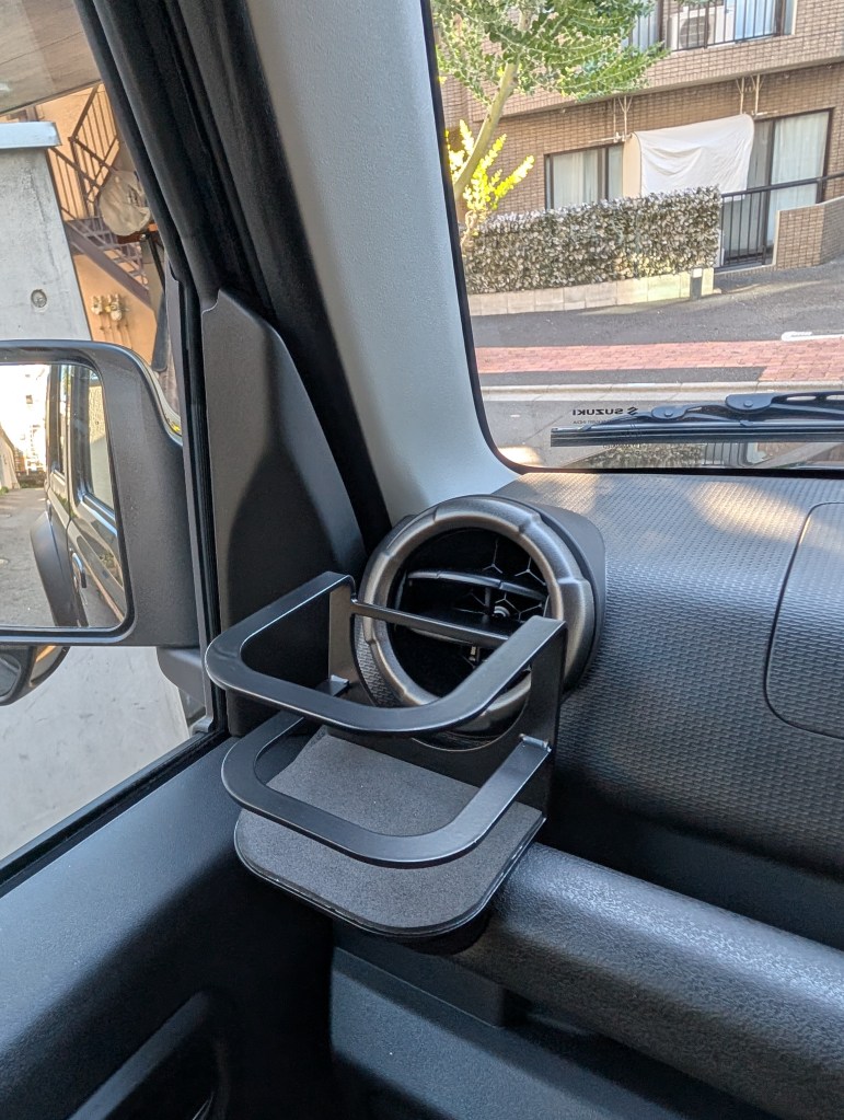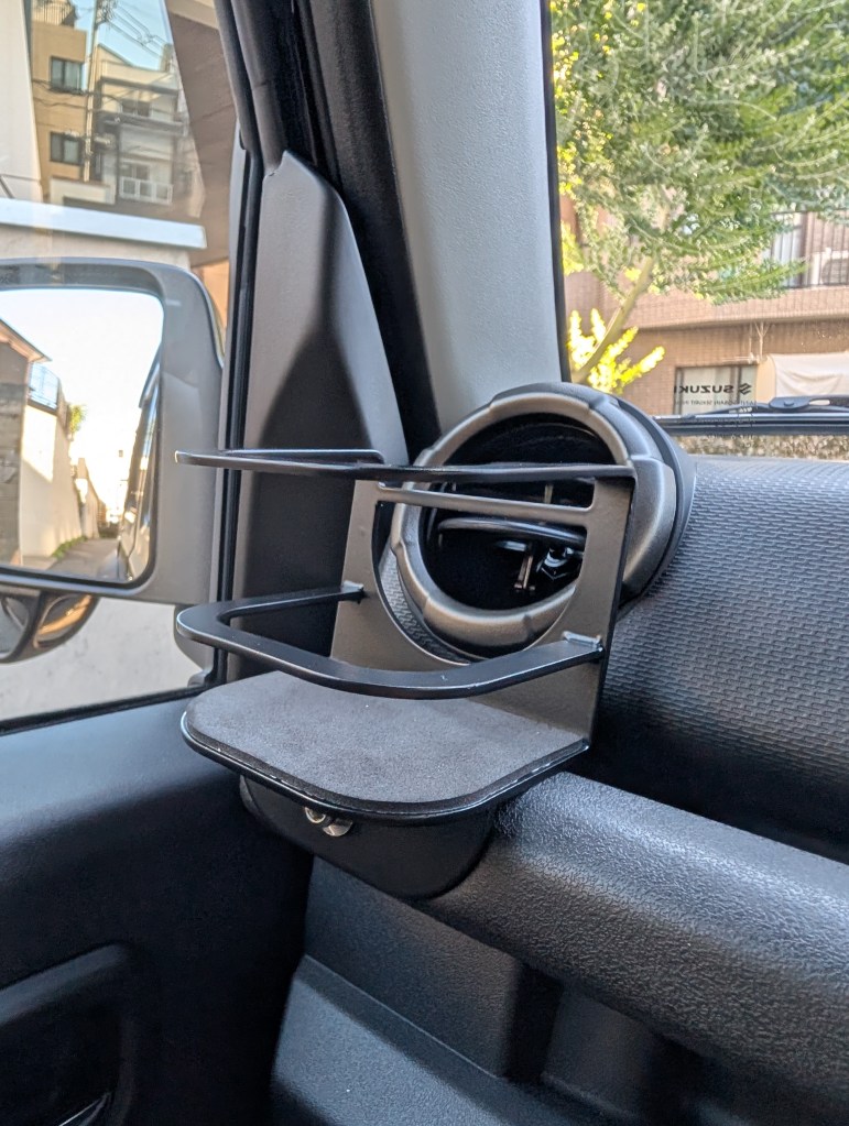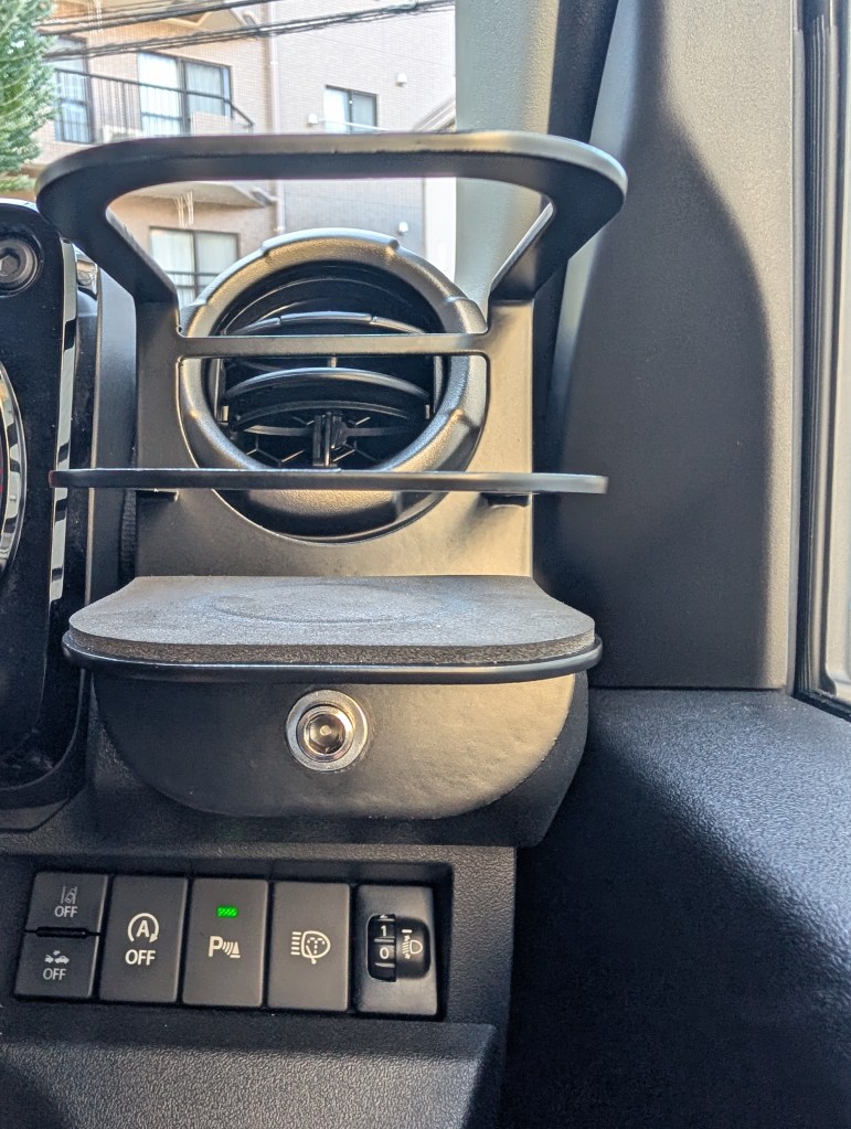 This is a steel drink holder. I bought it because I thought it would fit the Jimny’s rugged vibe.